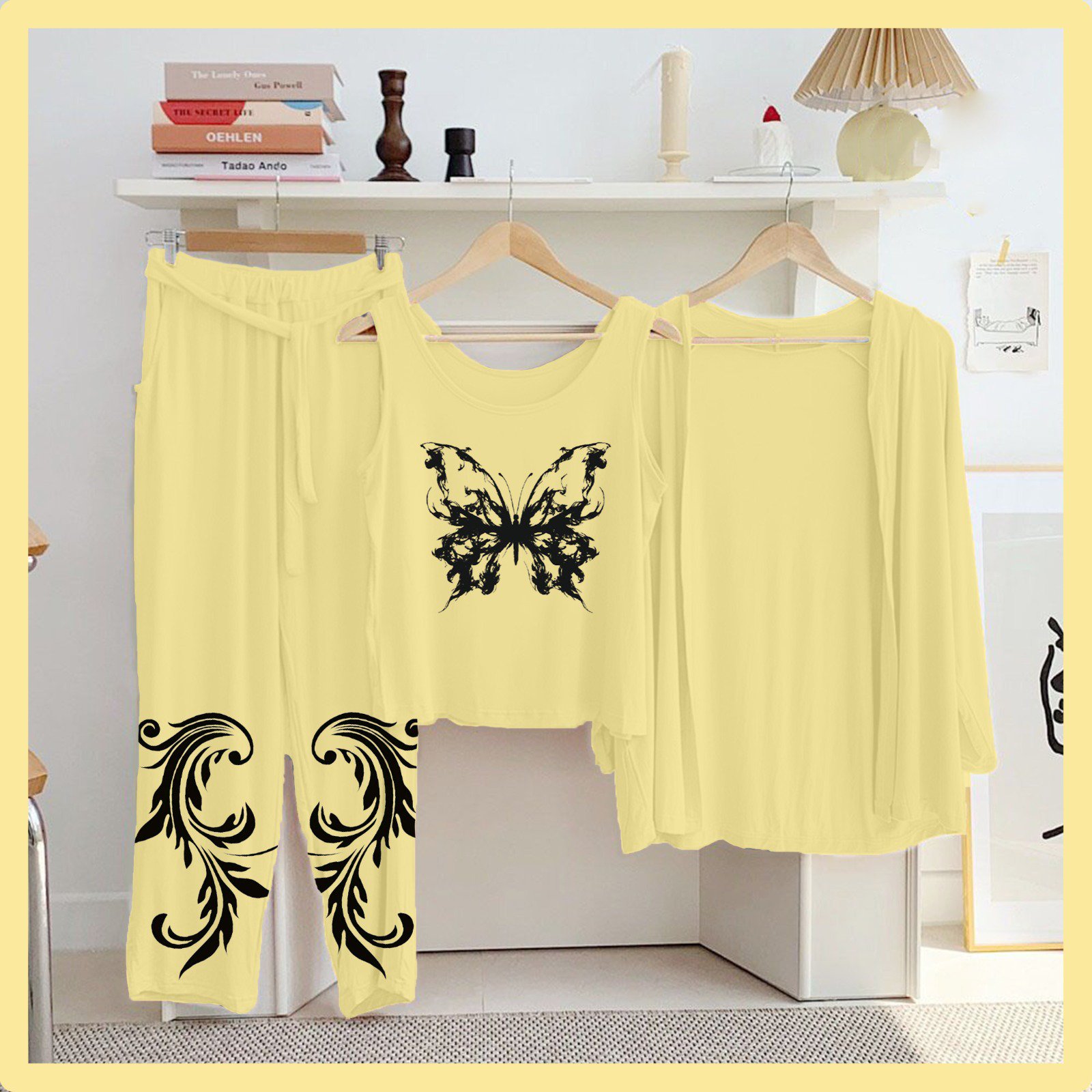 New Arrival – Printed 3-Piece Jersey Night Suit for Women (Lemon Color)